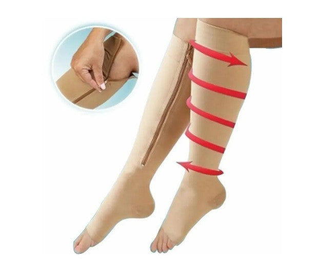 Medias elásticas de compresión "Zip-Up", elaboradas para ayudar a mejorar la circulación de las piernas. @Recomendadas para: Piernas cansadas o hinchadas. Varices, Dolor en las piernas @Quienes tienen mucho tiempo sentados o de pie. Viajes prolongados. @Máxima comodidad y confort @color beige solamente @@GUÍA DE TALLAS: Nuestras medias especiales para varices y piernas cansadas, no se rigen por la talla y peso como las medias comunes, se rigen por la circunferencia de la pierna pantorrilla o chamorro. Para que brinden una compresión adecuada de 20 a 30 mmHg, se recomienda seguir esta guía de Tallas: @Mida la circunferencia de la pantorrilla las pulgadas. Talla S/M (pantorrilla de 10 a 14 pulgadas de diámetro). Talla L/XL (pantorrilla de 14 a 17 pulgadas de diámetro).