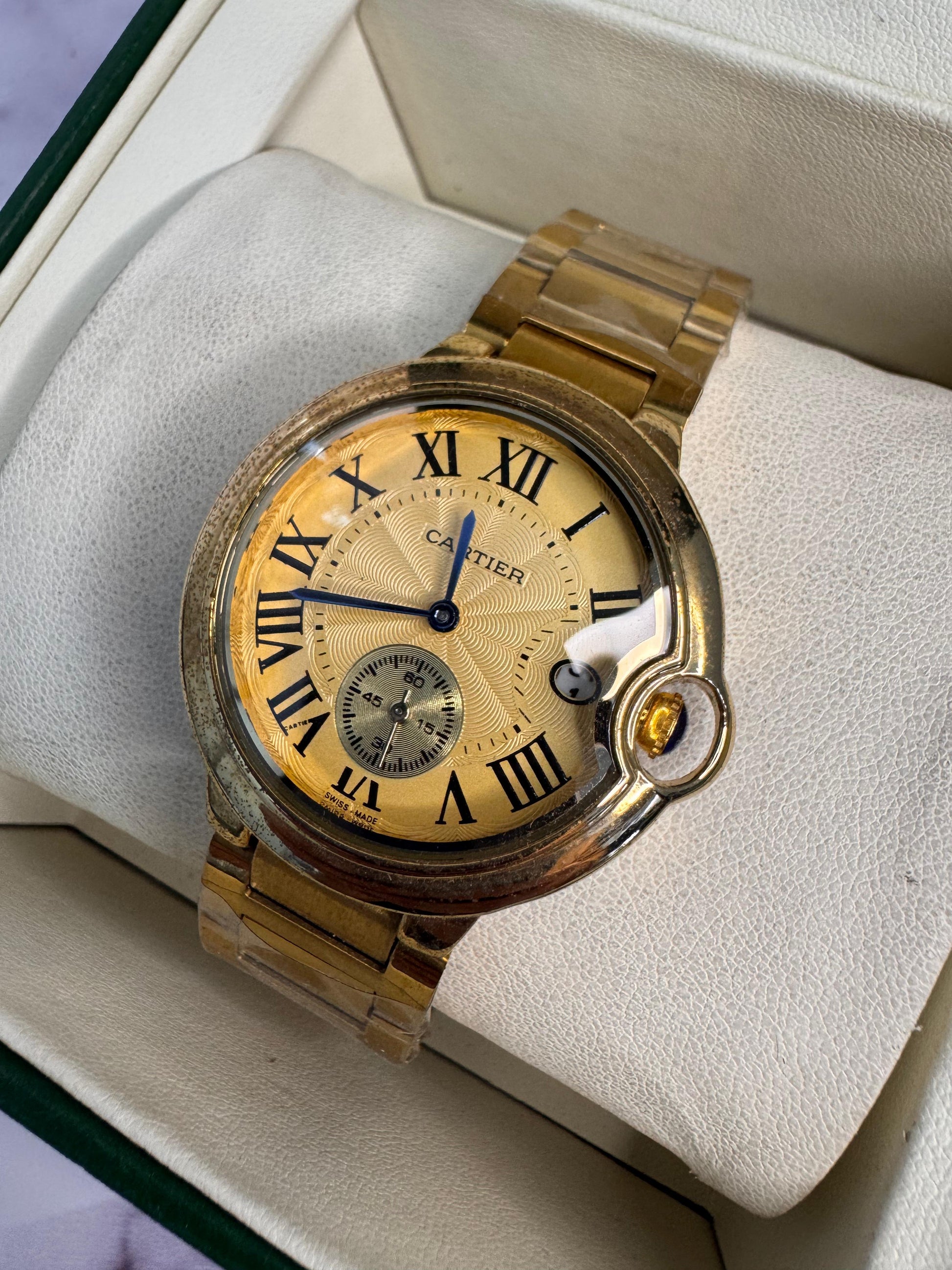 Un símbolo de distinción y refinamiento, este reloj Cartier combina diseño clásico con materiales de alta gama.