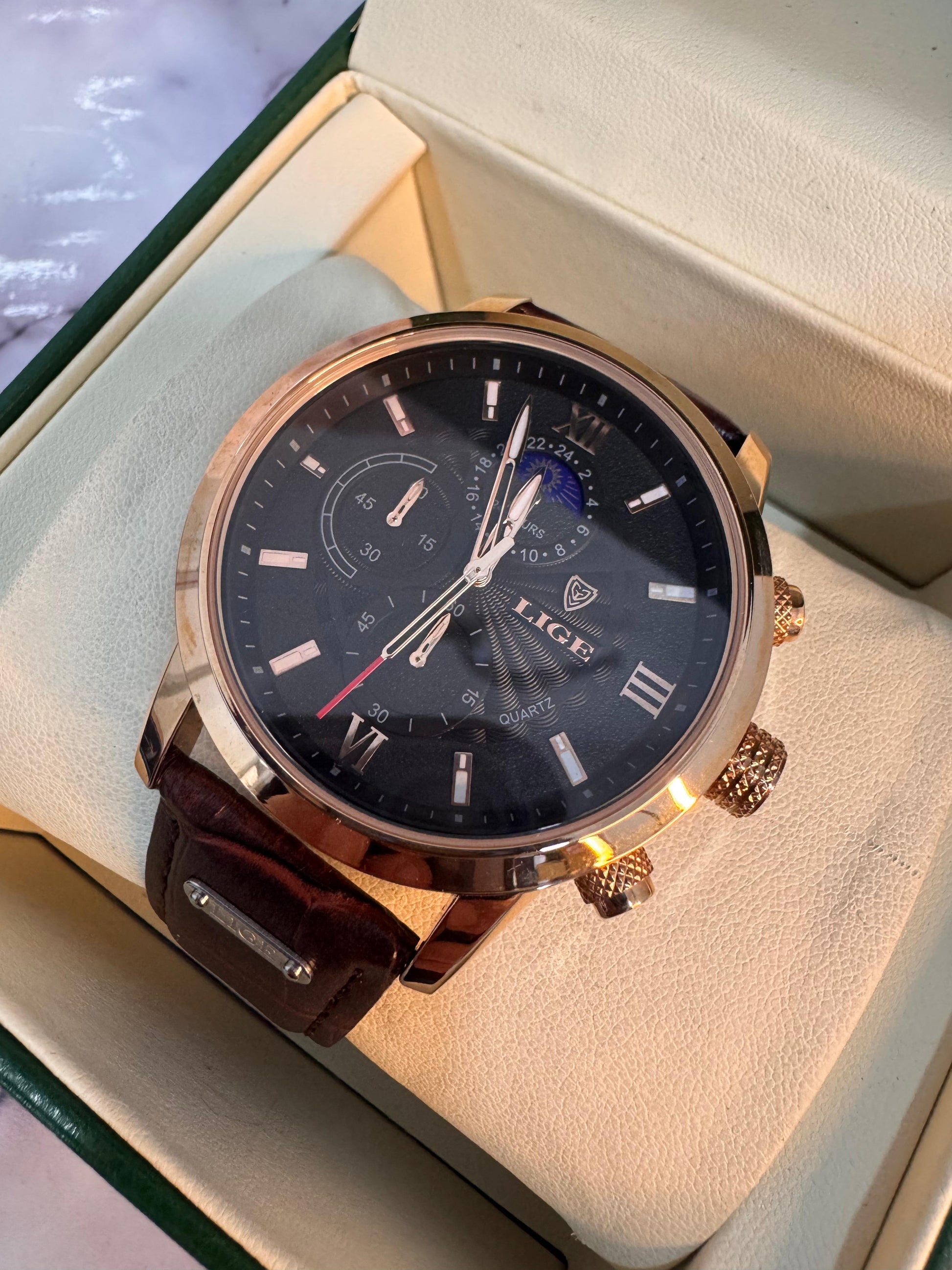 Una pieza que refleja elegancia y carácter. Con un diseño moderno y acabados finos, el reloj LIGE es el complemento ideal para quienes valoran el tiempo con estilo.